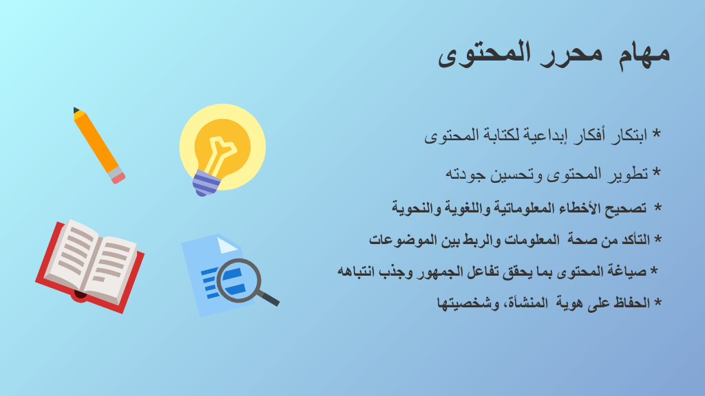 - محتواك ينبغي أن يتضمن ثلاثة عناصر: الموضوع ، والفكرة ، والعرض ويتم تحديد الموضوع والفكرة قبل بدء كتابة المحتوى ، ثم يأتي تحديد طريقة العرض.